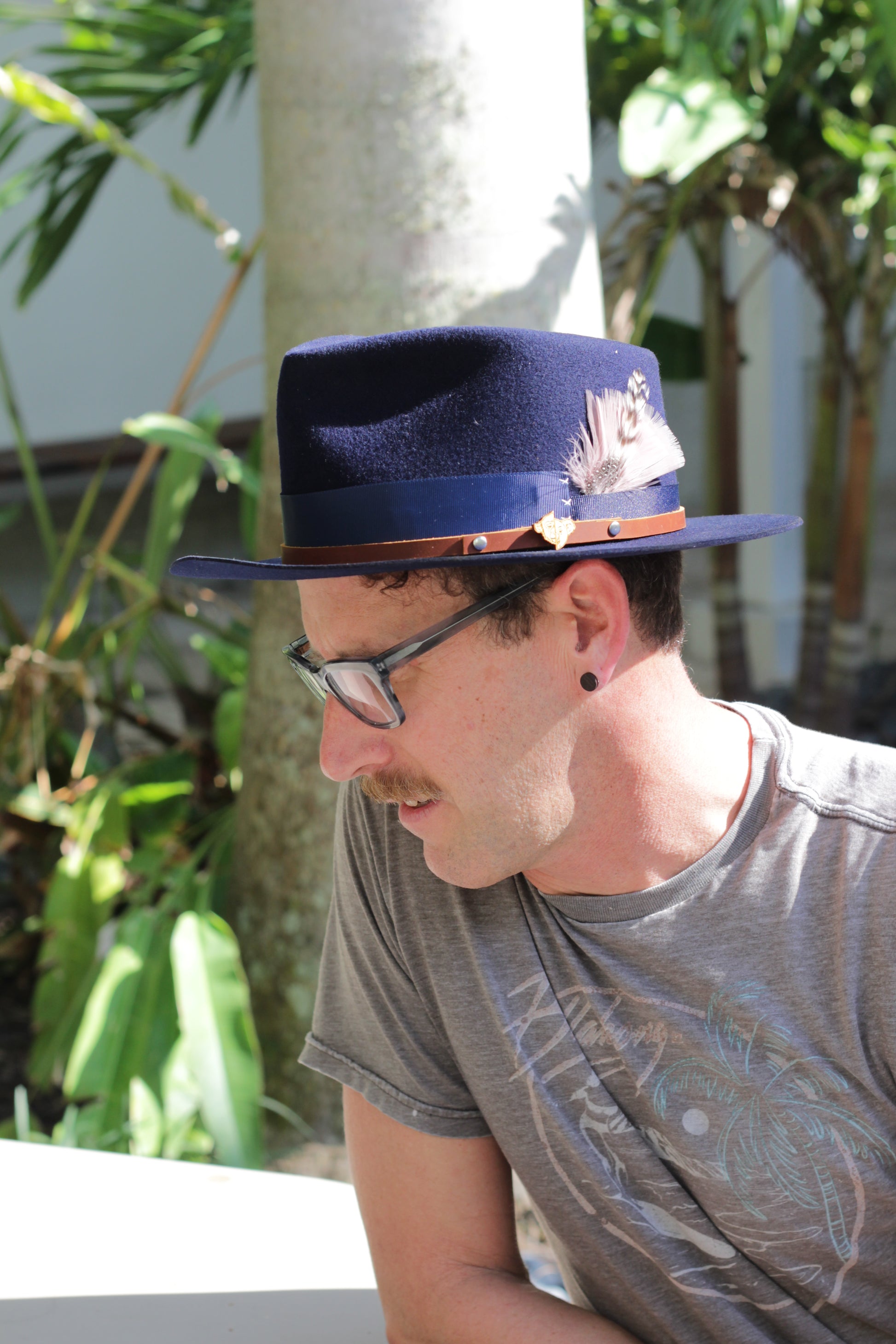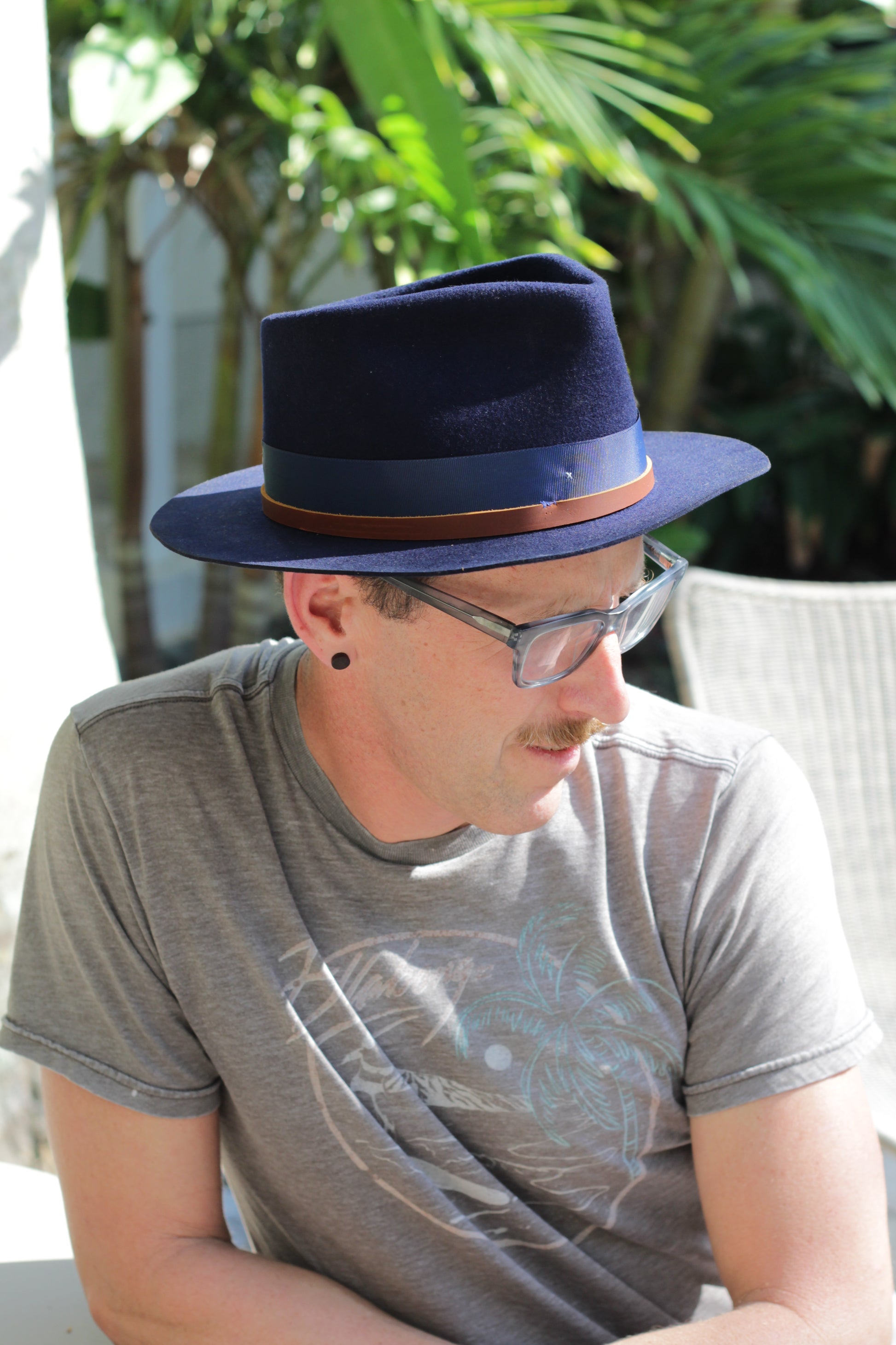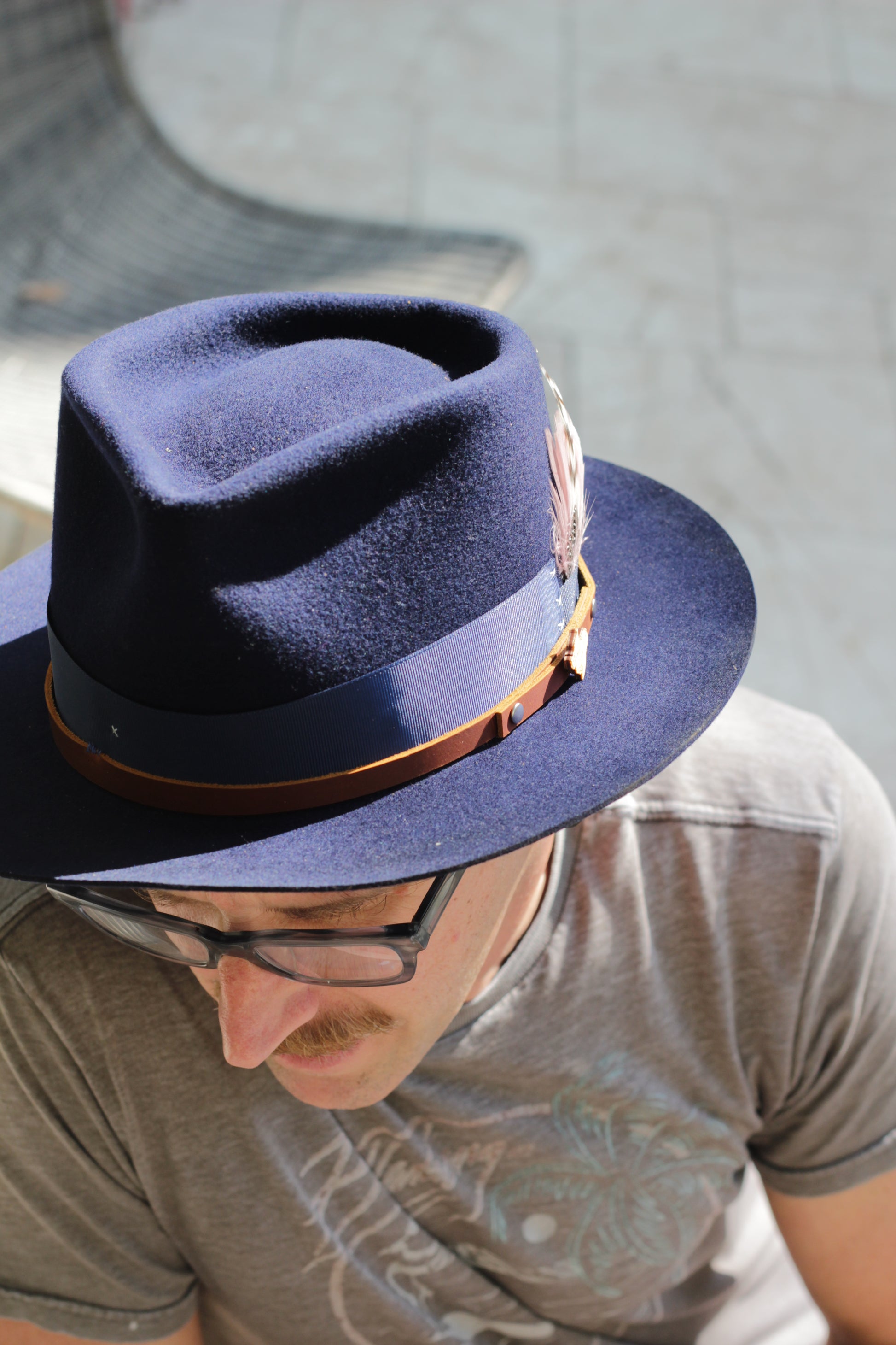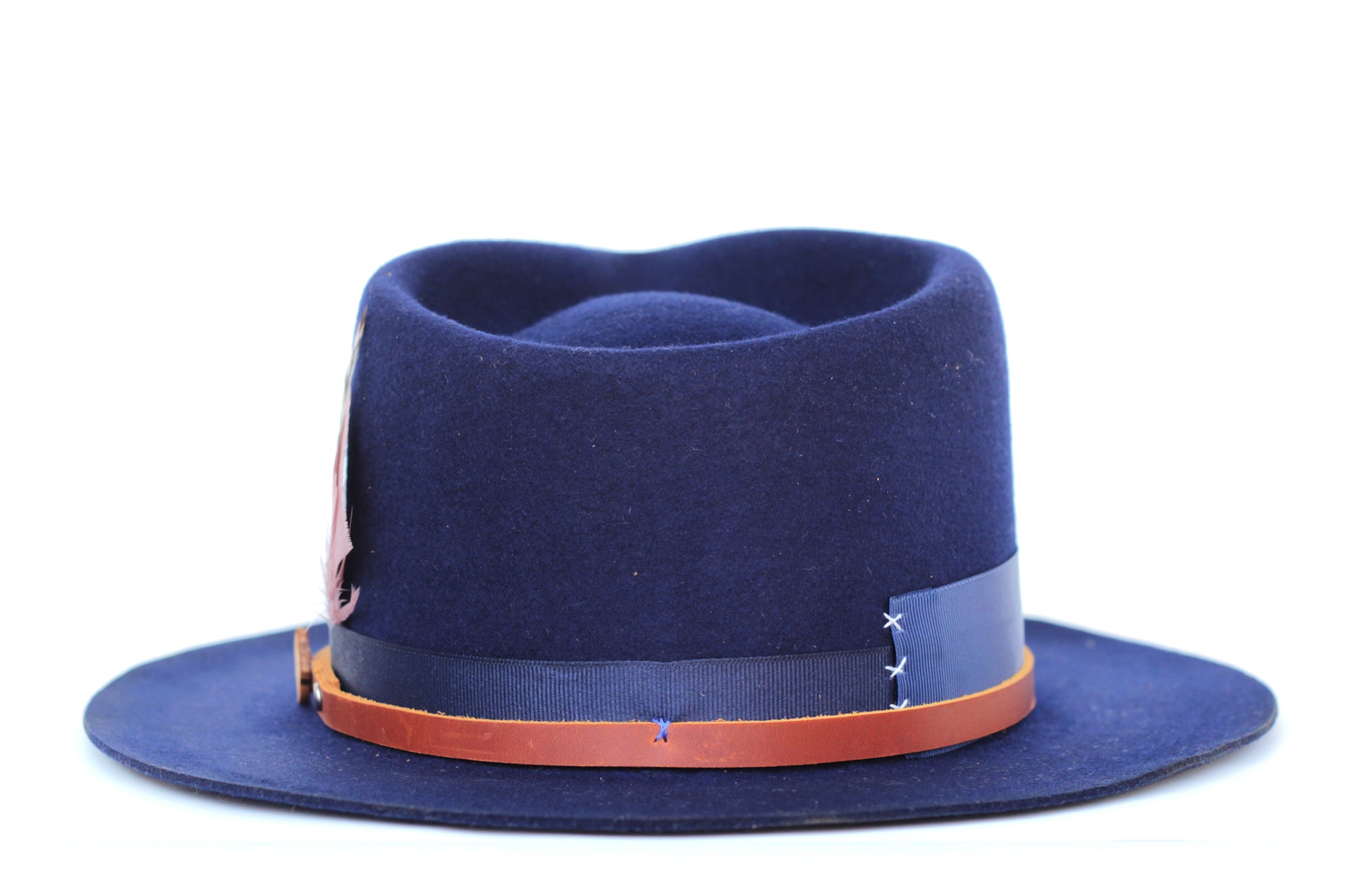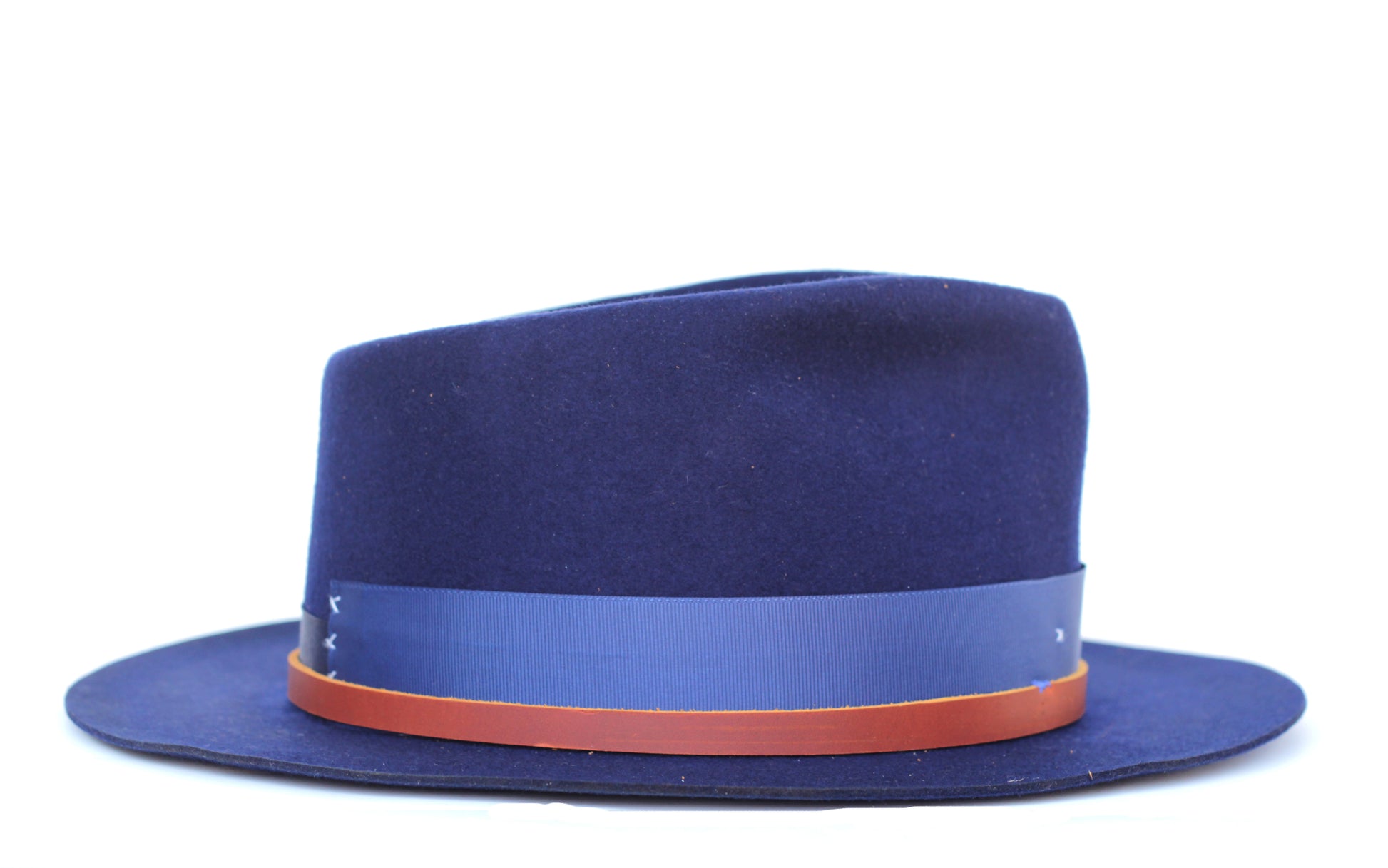 - Hat Band: 2-1" blue Grosgrain, brown leather band