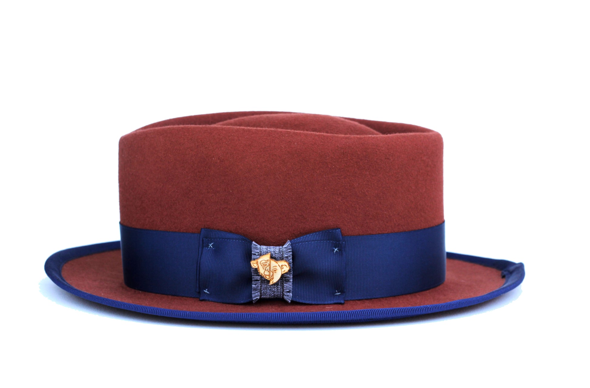 - Brim band: 1" blue grosgrain wrap