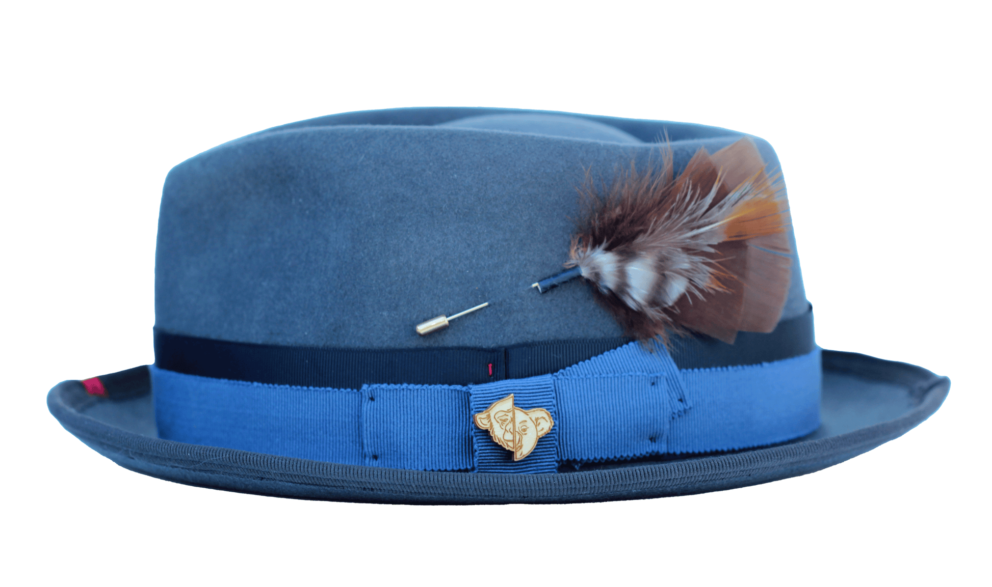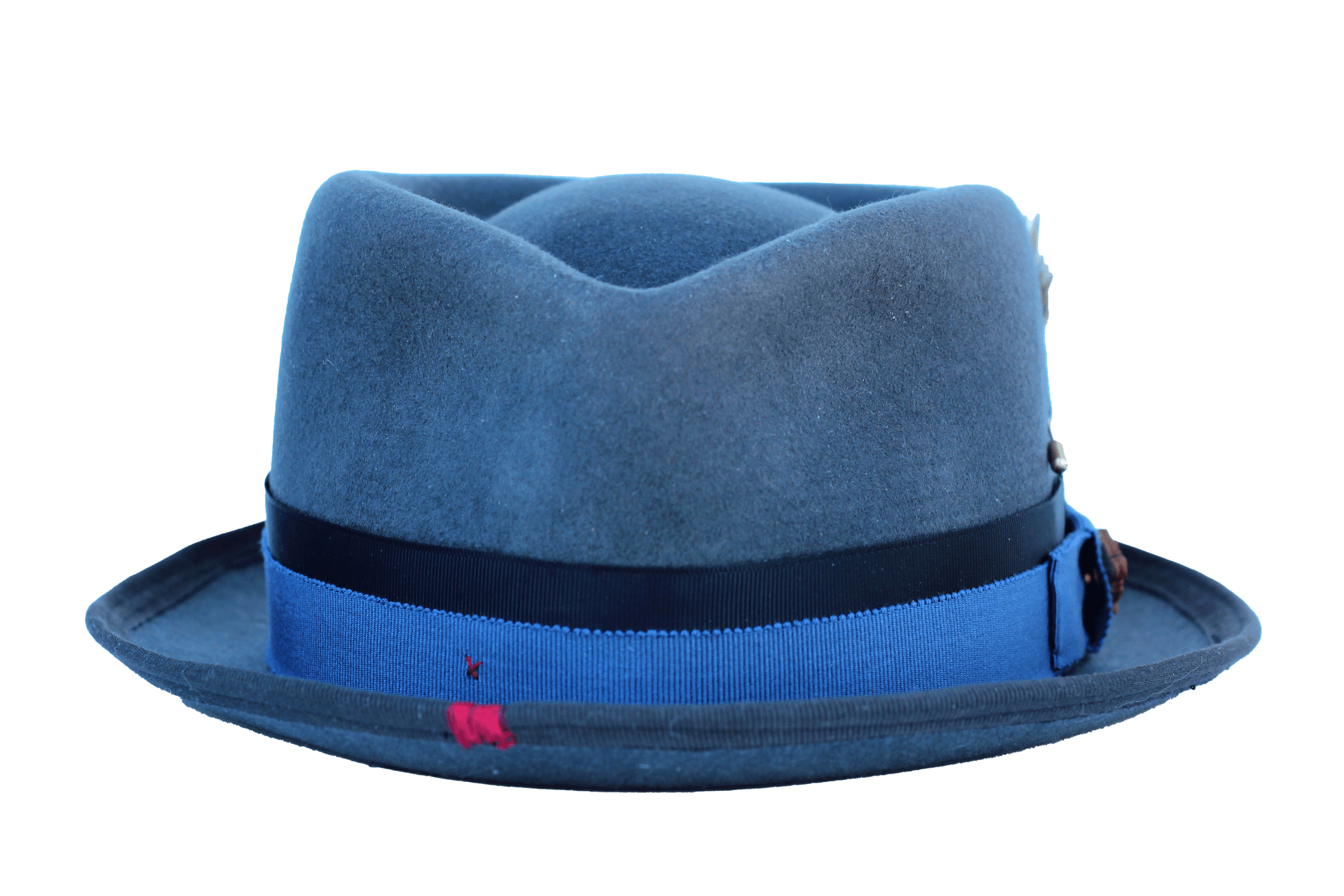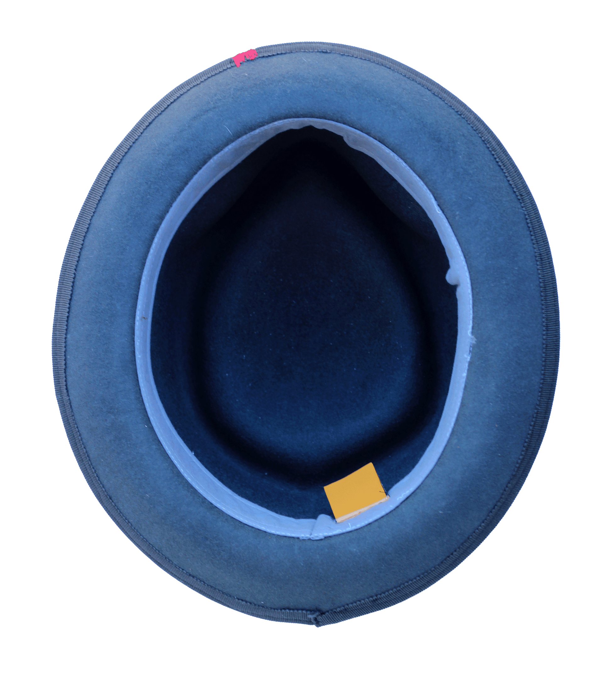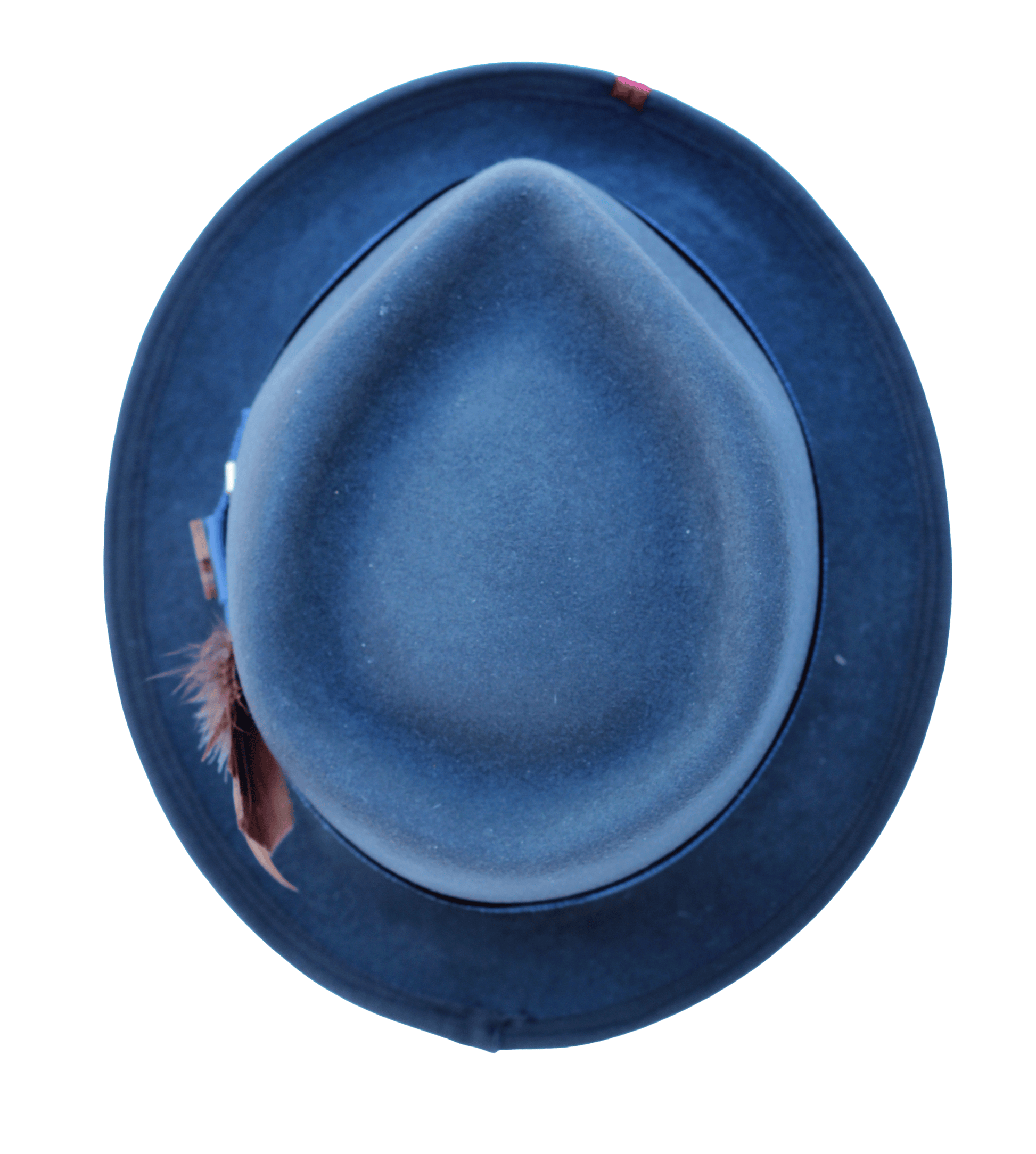 Colombian handmade fedora. This all-season hat features a Teardrop shape mid crown center with a 3 inch hard brim with a small curve. Blue grosgrain hatband with a wicked wooden logo pin and feather.