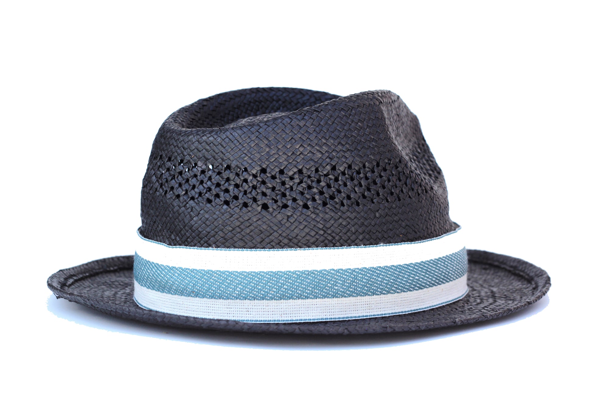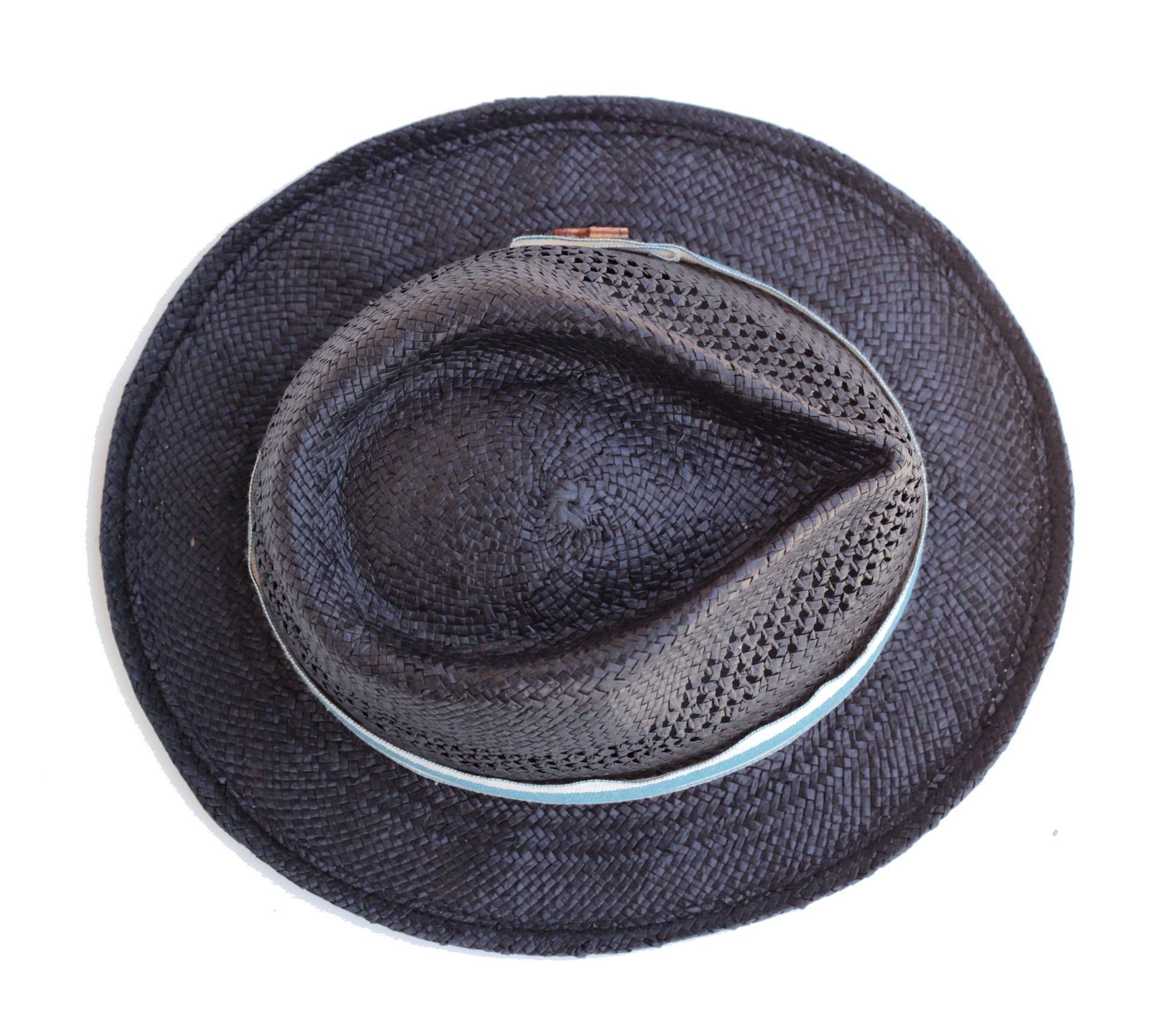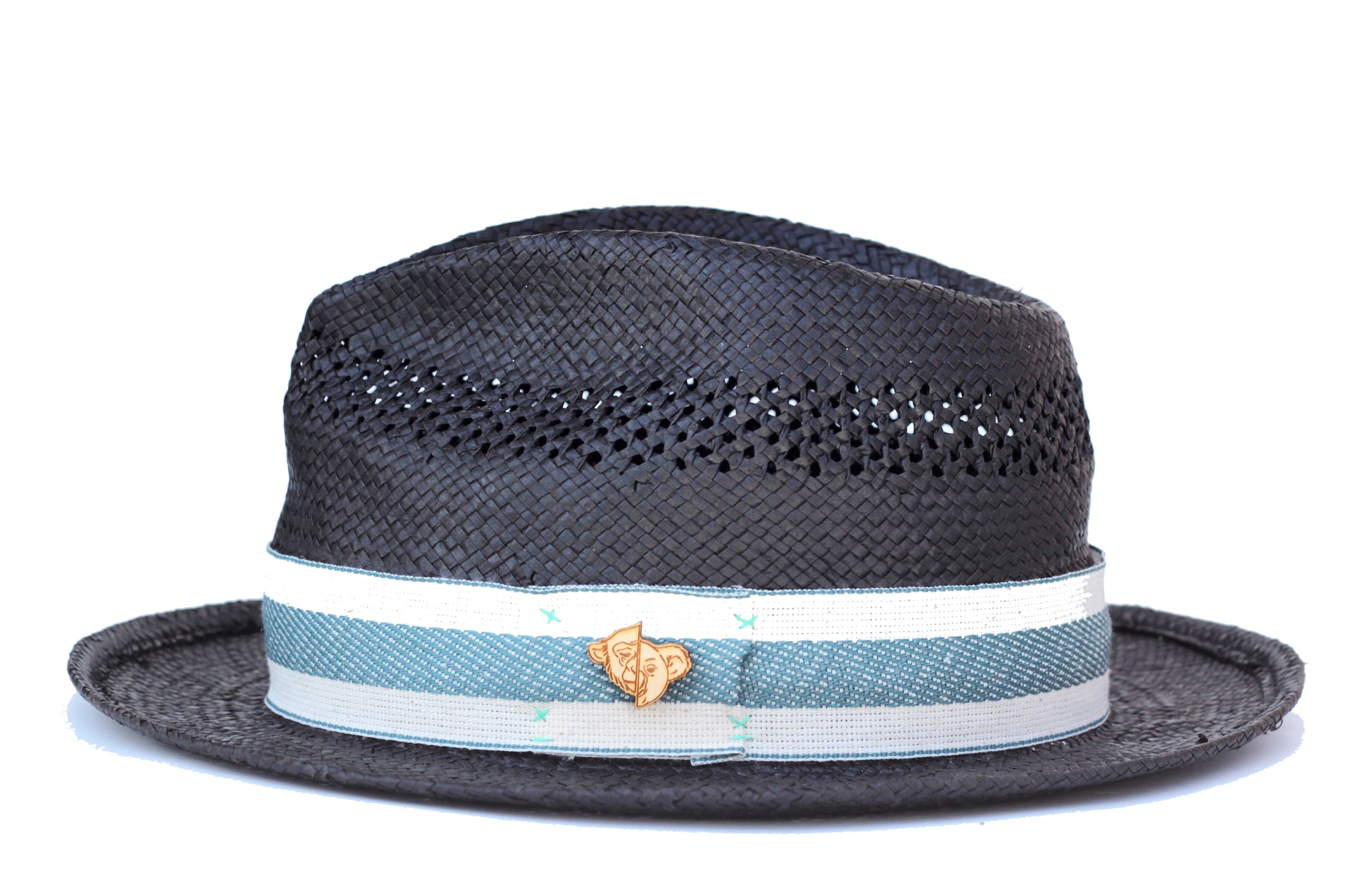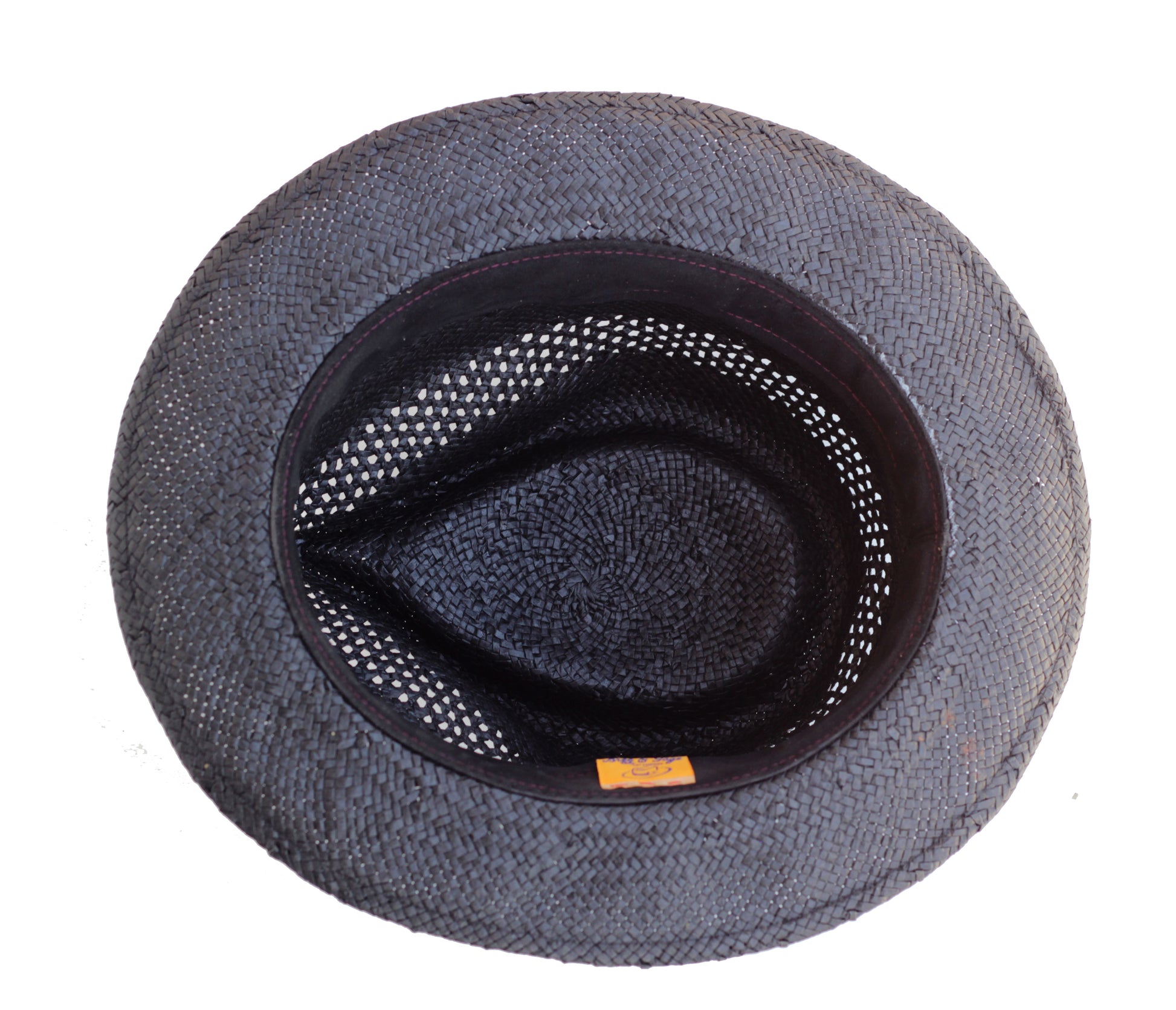 Colombian handmade Black Straw fedora. This summer hat features a tear drop shape short crown center with a 2 inch soft brim with a small curve. 2 inch grosgrain hatband with grosgrain brim wrap with wooden logo pin. Also a wicked sweatband.