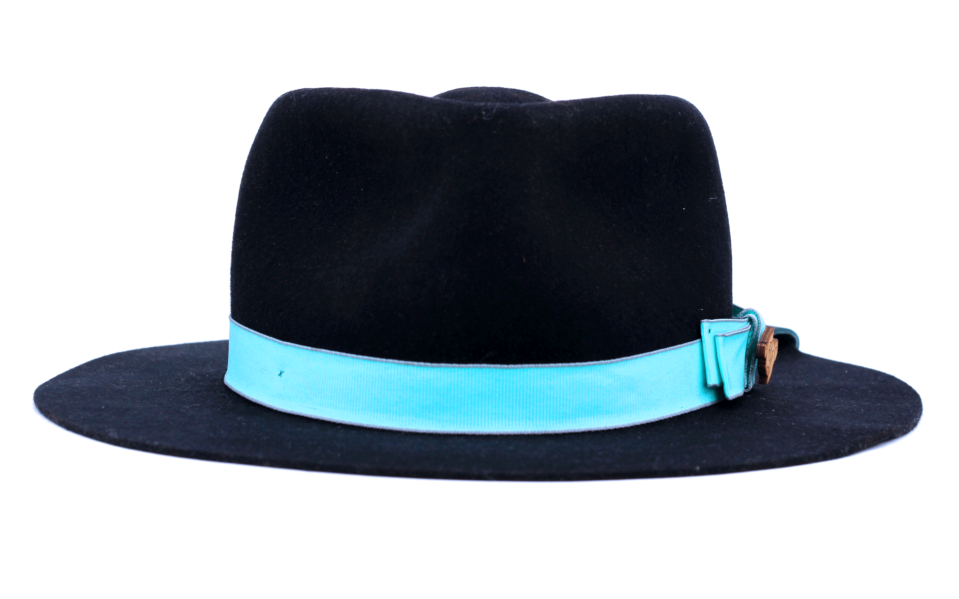 Colombian handmade fedora. This all-season hat features a tear drop tall crown center with a 2 1/2” soft brim and leather clip on the left side. 1 in grosgrain hatband with wooden logo pin. Also a wicked sweatband. Mr. Blue was a man who traveled all over the world selling ice. This hat represents him.