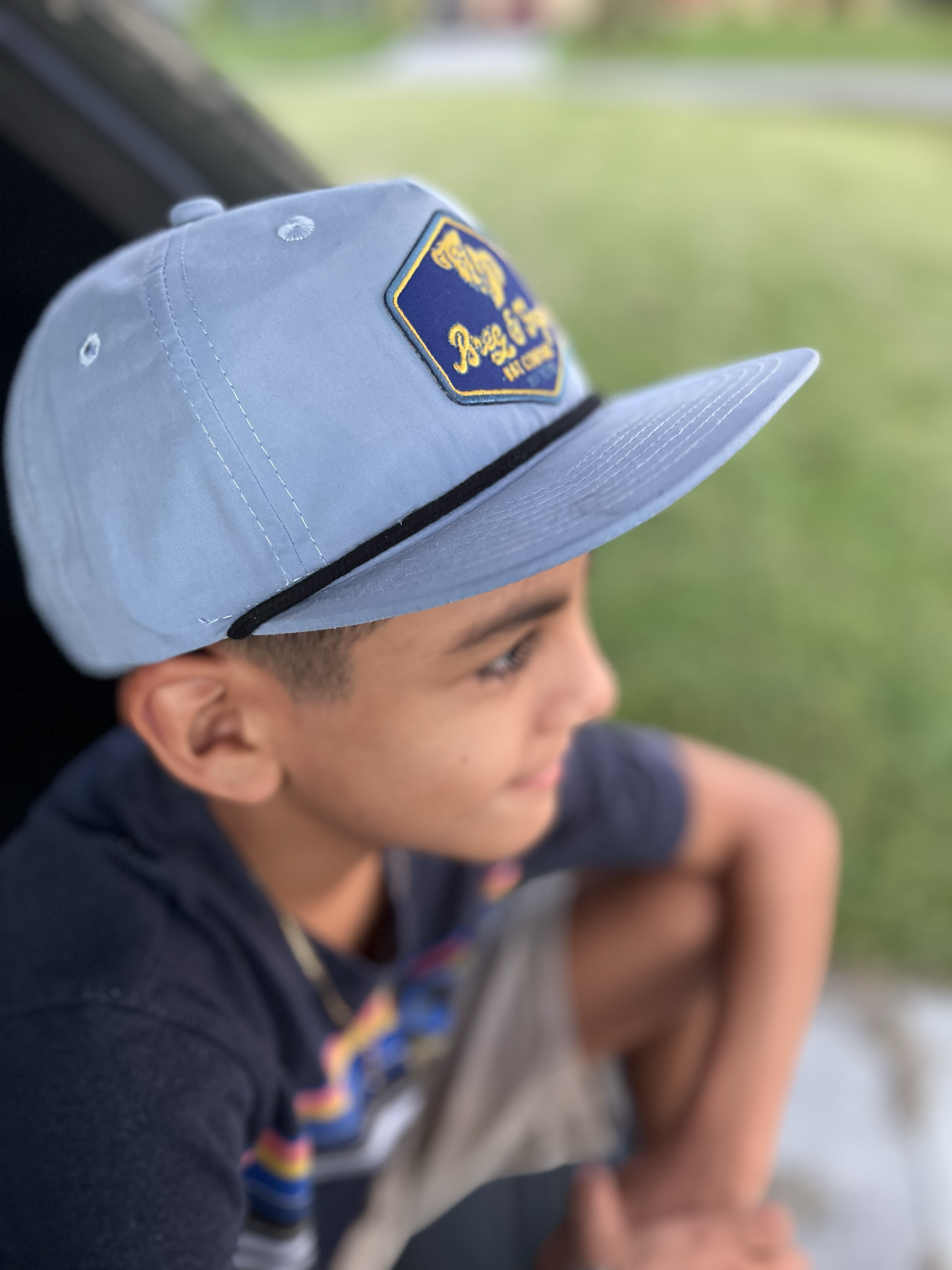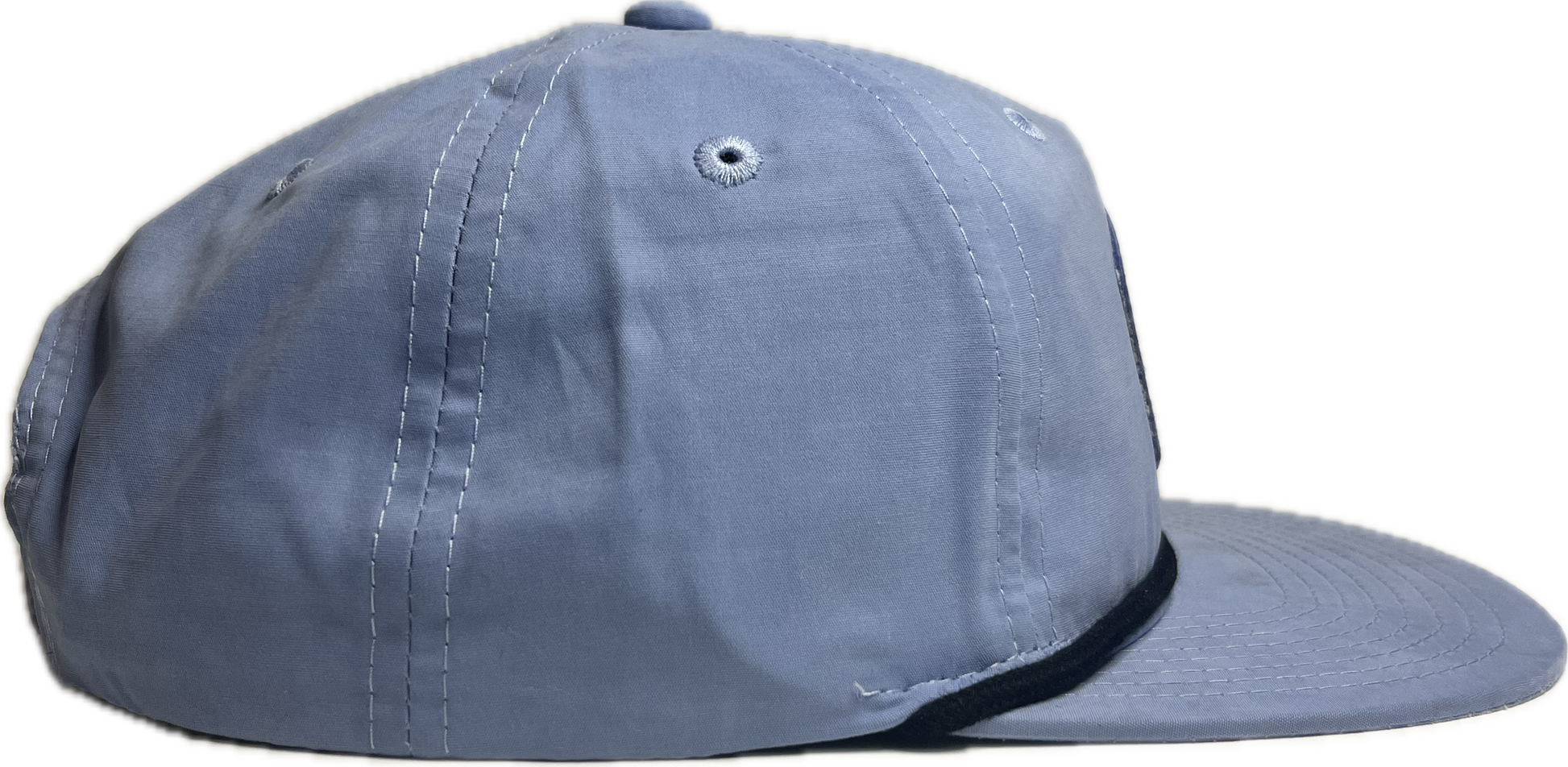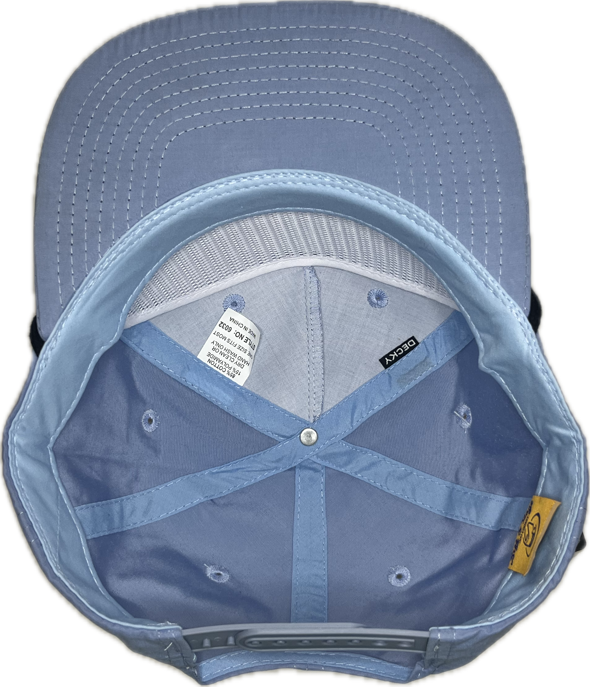 The Decky 6032 - Classic Rope Cap, 5 Panel Flat Bill Hat, Snapback is an unconstructed 5 panel cap. It features a flip-up buckram, braid at the base of the crown, and a retro flat bill style. The cap has an integrated cotton sweatband, ventilation eyelets, and is finished with a plastic snap closure for a perfect fit.