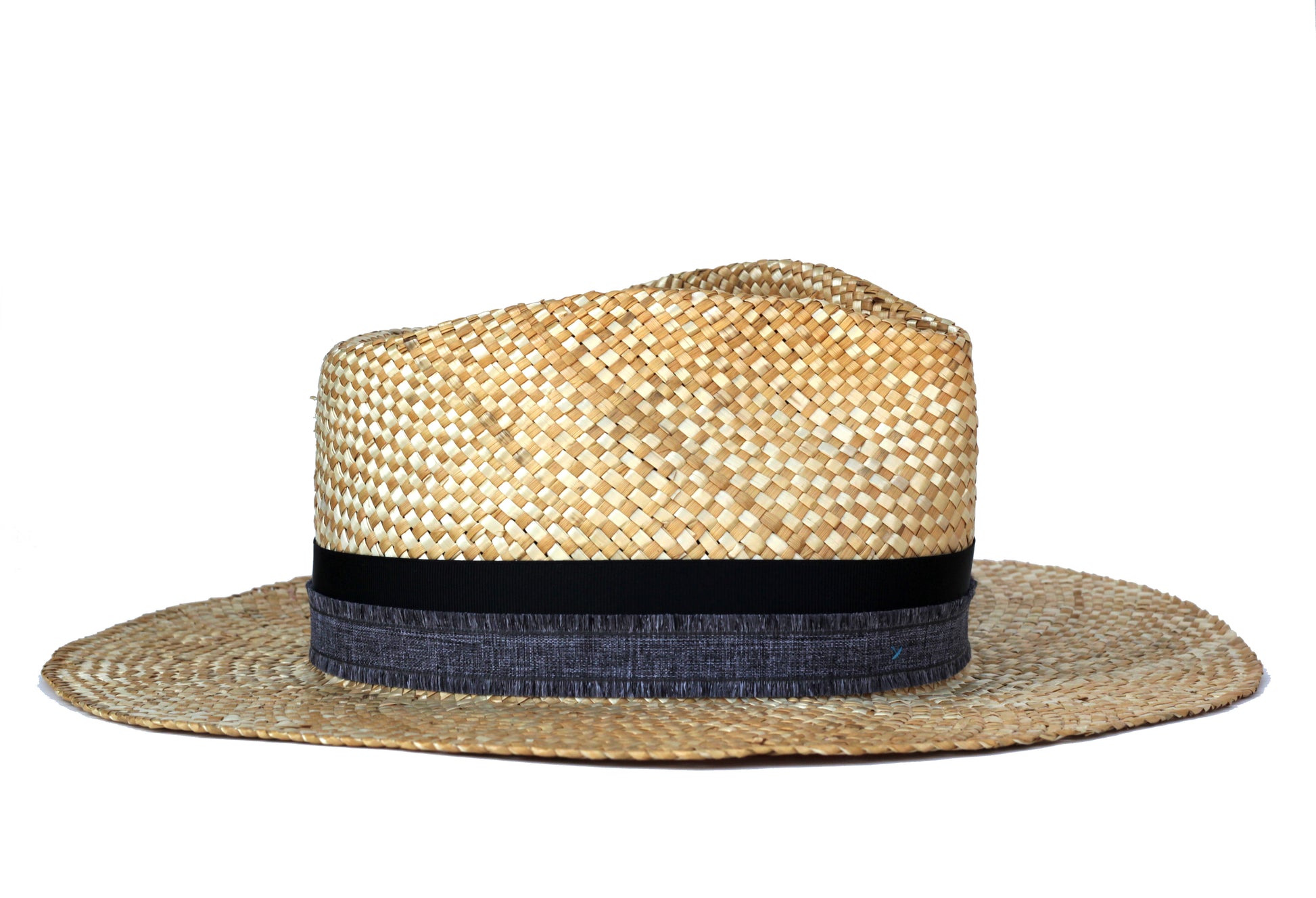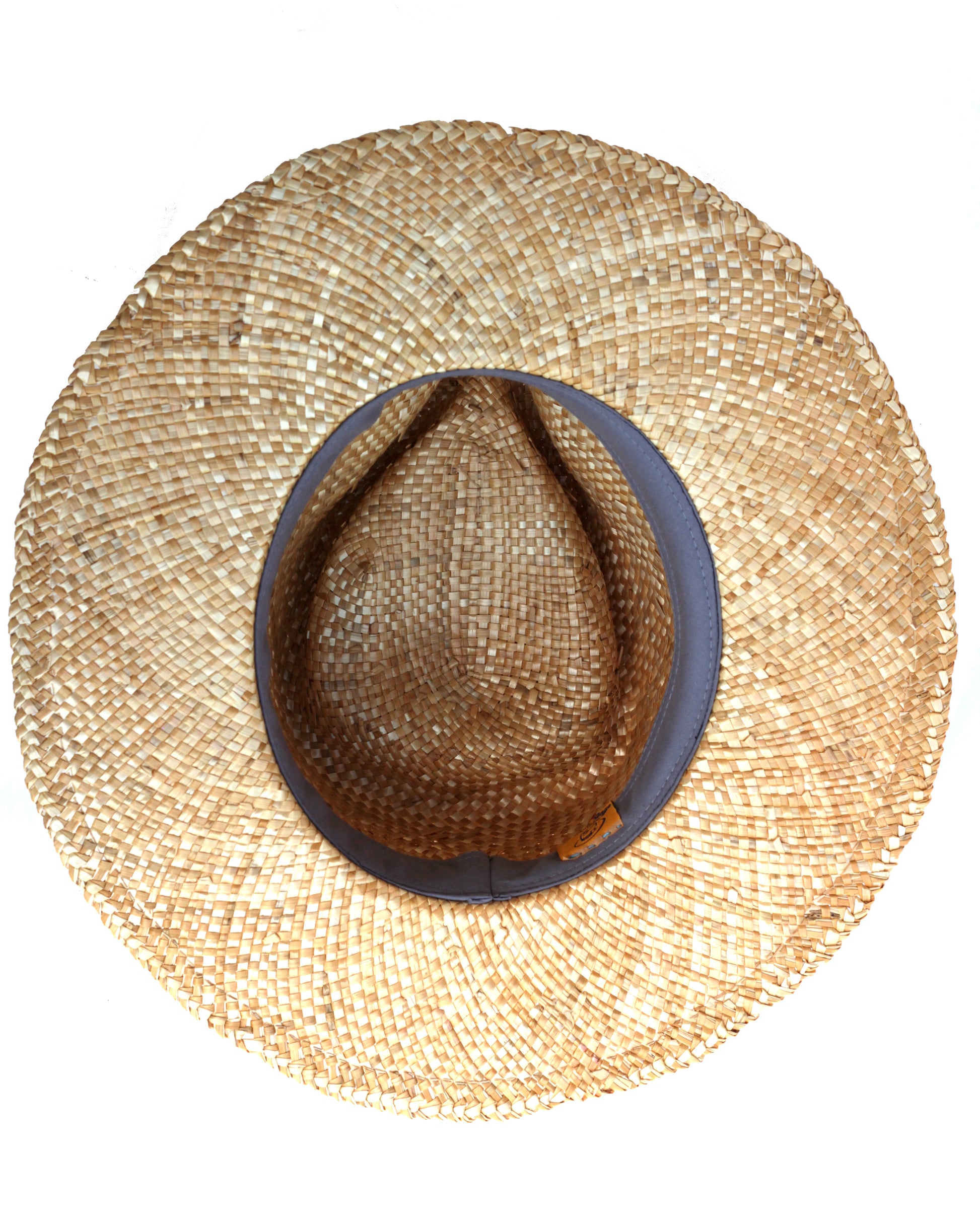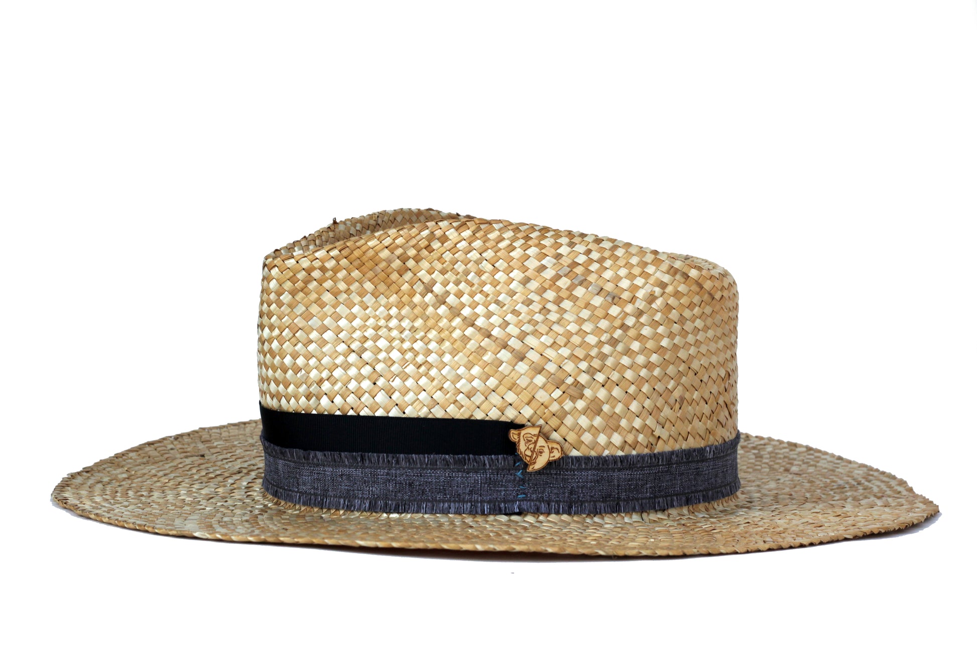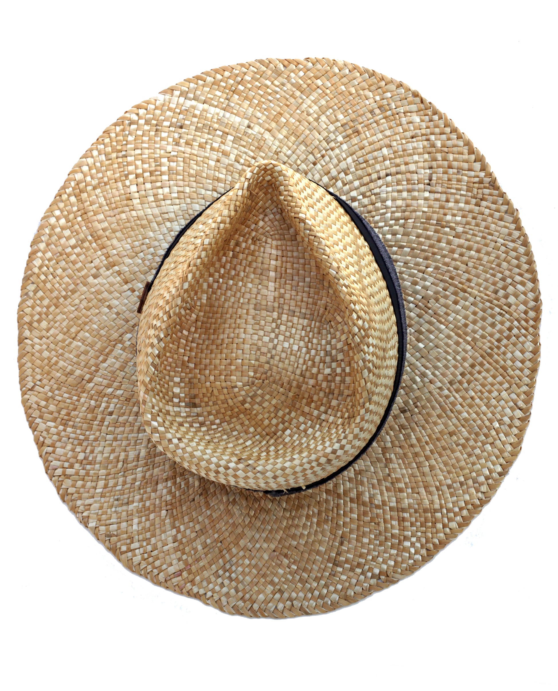 Colombian handmade Straw fedora. This summer hat features a tear drop shape tall crown center with a 3.2inch soft brim with a small front curve. 2 inch grosgrain hatband with grosgrain brim wrap with wooden logo pin. Also a wicked sweatband.