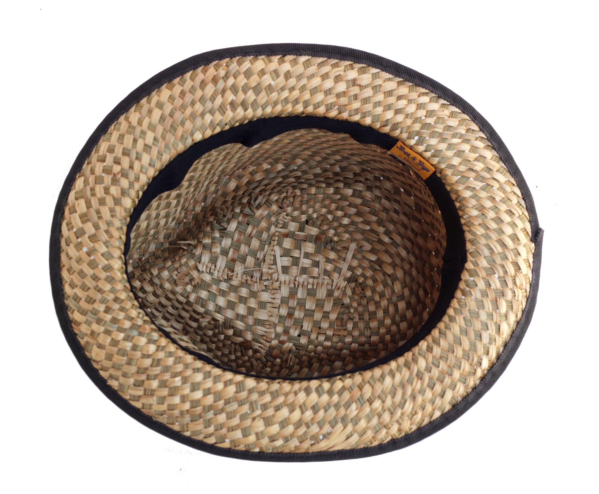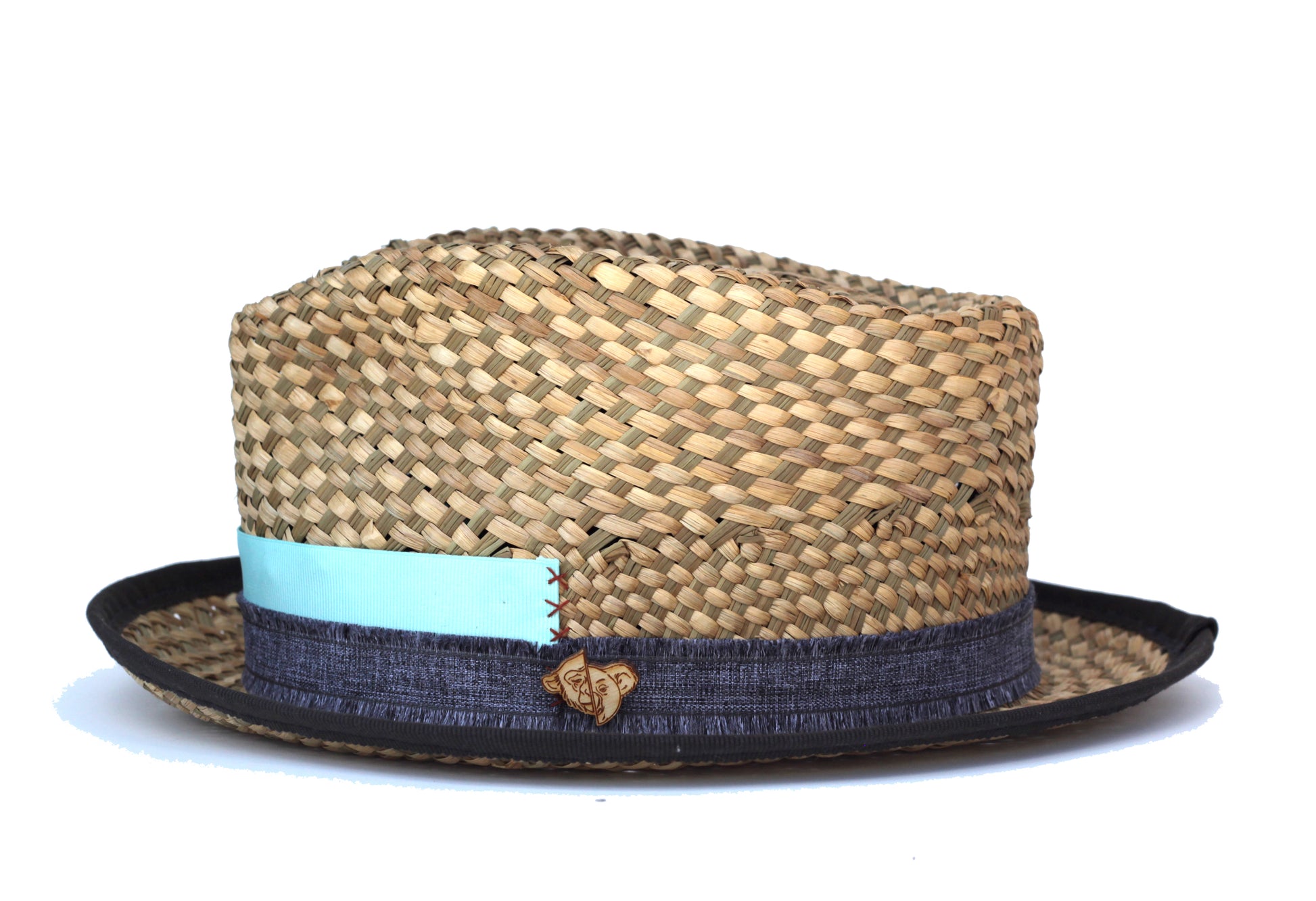 Colombian handmade Seagrass Straw fedora. This summer hat features a tear drop shape short crown center with a 2 inch soft brim with a small curve. 2 inch grosgrain hatband with grosgrain brim wrap with wooden logo pin. Also a wicked sweatband.